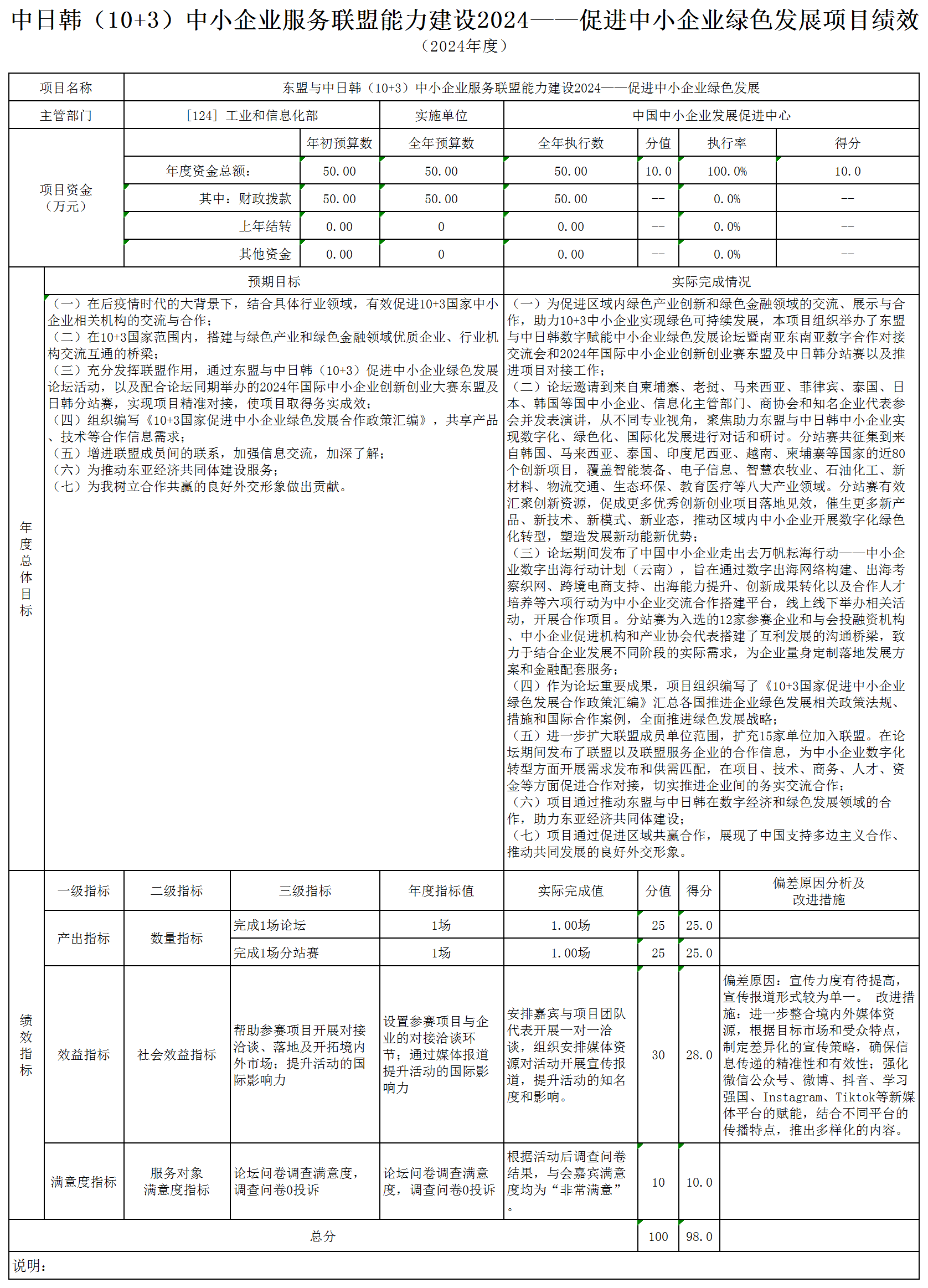 2024年度中心2個財政項目設置13個績效目標,項目績效目標及財政資金支付全部完成。“促進中小企業(yè)高質(zhì)量發(fā)展評估和研究”項目支出201.69萬元,9個績效目標全部完成;“東盟與中日韓(10+3)中小企業(yè)服務聯(lián)盟能力建設2024——促進中小企業(yè)綠色發(fā)展”項目支出50萬元,4個績效目標全部完成。
