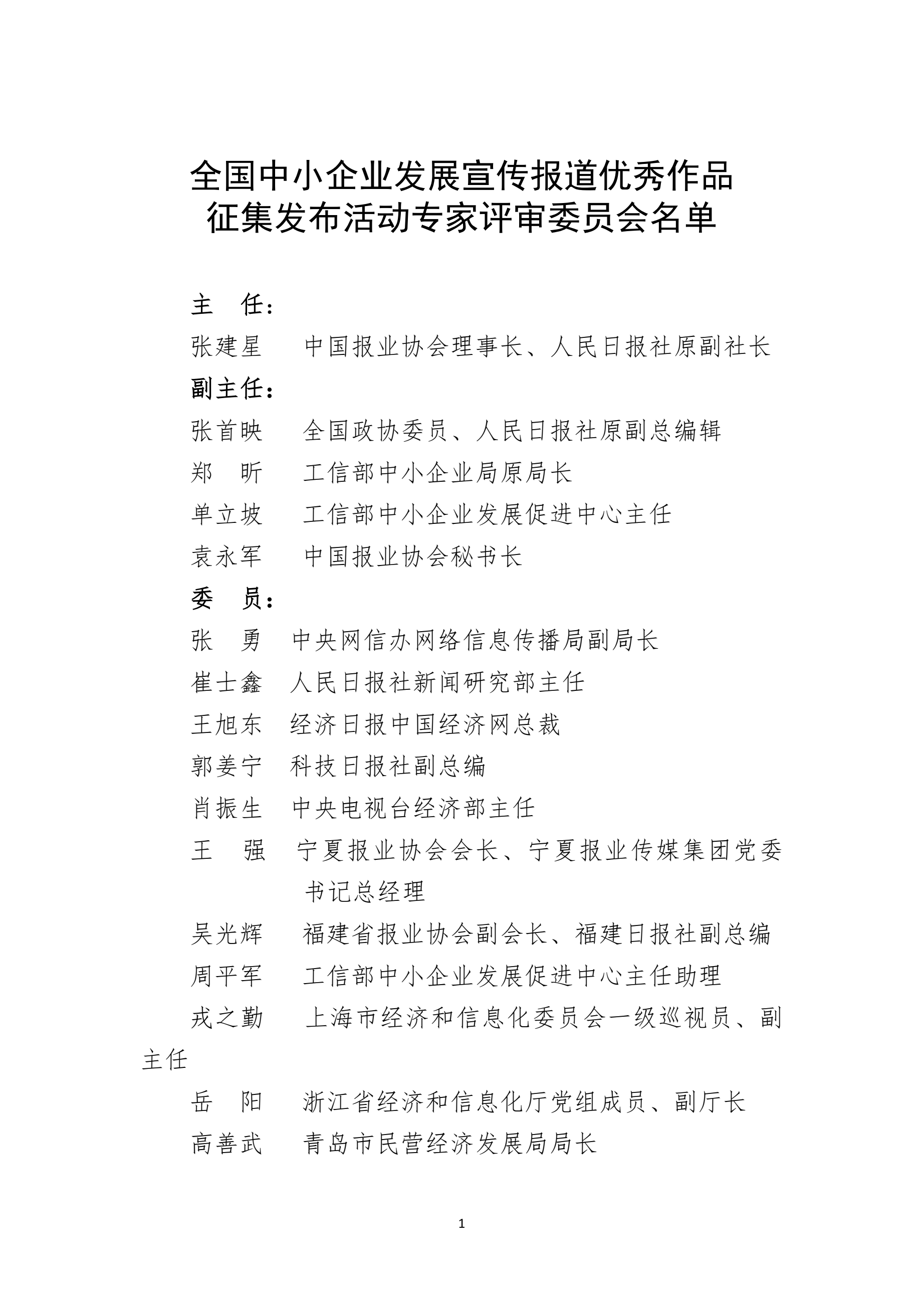 全國中小企業(yè)發(fā)展宣傳報道優(yōu)秀作品征集發(fā)布活動專家評審委員會名單